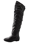 Black faux suede over the knee flats features round toe, slouchy stitched detailing, and elastic back tab. Cushion insole with traction sole.Shaft height measures approximately 22. Opening circumference 15 1/2 ".